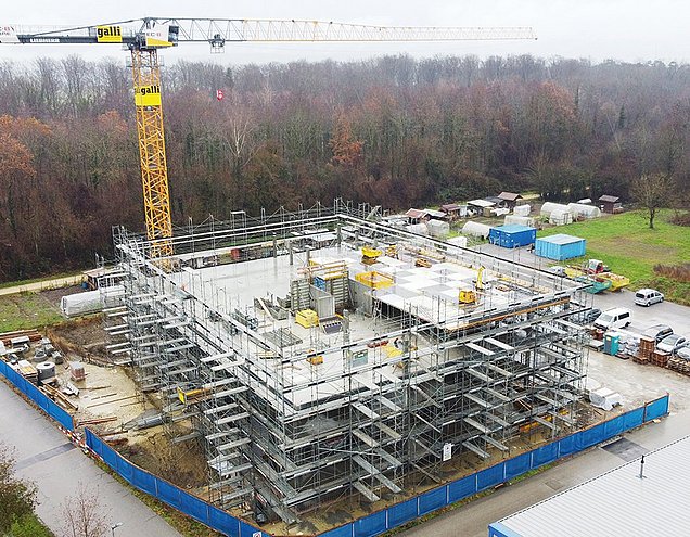 Il y a environ un an, les pelleteuses sont arrivées. Depuis, le nouveau centre de formation à Aarberg, dans le canton de Berne, prend forme jour après jour. Le plafond en béton au-dessus du premier étage est terminé, le deuxième étage est en cours de construction et, parallèlement, on observe déjà les travaux préparatoires pour la construction du troisième étage. Les fournisseurs montrent également des progrès : la fabrication des éléments de façade et des salles d’eau est terminée. Les installations techniques au sous-sol et au rez-de-chaussée avancent rapidement.